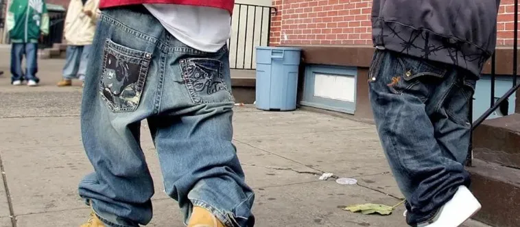 What '90s fashion trend involved wearing baggy pants low on the hips, often showing underwear?